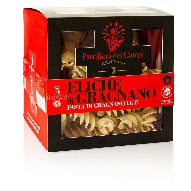 ZUTATEN / PRODUKTINFO: Teigwaren aus Hartweizengrieß. Zutaten: HARTWEIZENGRIEß, Wasser. In der Bronzeform gezogen, Pasta di Gragnano I.G.P. Kochzeit: 10 Minuten. Kühl und trocken lagern.