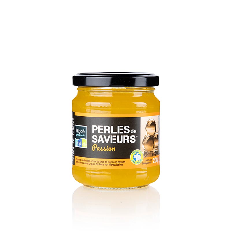 ZUTATEN / PRODUKTINFO: Gelierte Perlen aus Passionsfrucht-Sirup mit flüssigem Kern. Zutaten: 63% Maracuja-Sirup (Zucker, Wasser, Saft der Passionsfrucht und anderer Früchte, Farbstoff: Lutein E161b, Aromen, Emulgatoren: Gummi Arabicum, Estergummi), Wasser, Verdickungsmittel: Cellulose- Gummi, Geliermittel: Calciumchlorid, Natriumalginat, Farbstoff: Lutein E161b, Konservierungsstoff: Kaliumsorbat. Nach dem Öffnen im Kühlschrank lagern und innerhalb von 5 Tagen verbrauchen. Produkt aus Frankreich.