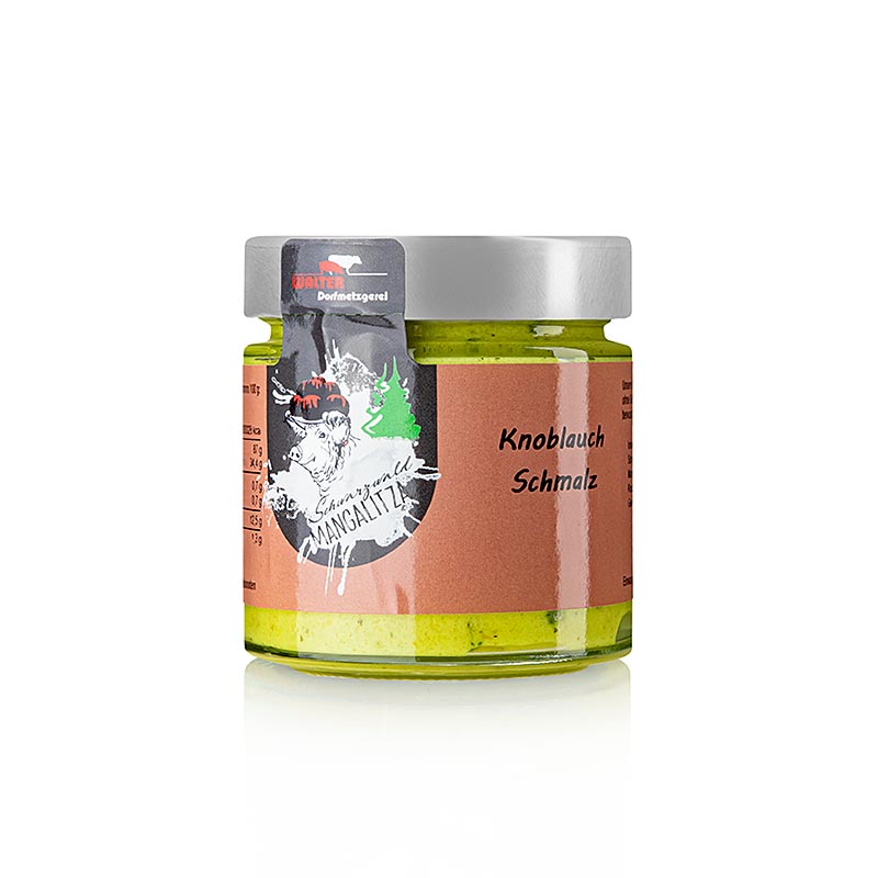 ZUTATEN / PRODUKTINFO: Dorfmetzgerei Walter Knoblauchschmalz. Zutaten: 71% Mangalitza Schweinespeck und Flomen, 20% Mangalitza Schweinefleisch, Grieben, 8% Knoblauch, Steinsalz, Gewürze, Kräuter, Gemüseextrakt, Kurkuma, Ringelblumen. Kühl bis max. +7°C lagern.