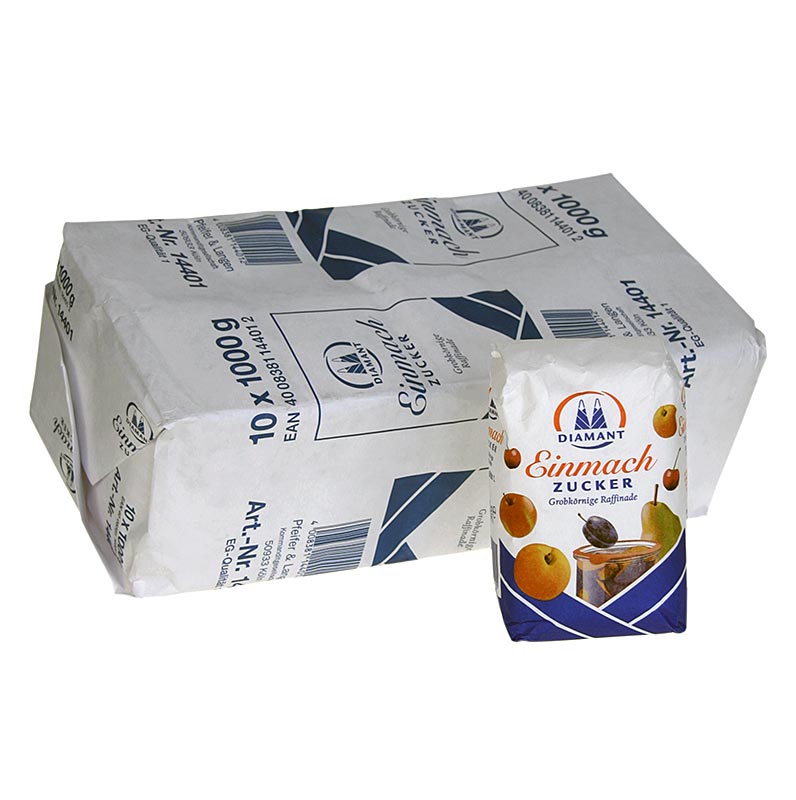 ZUTATEN / PRODUKTINFO: Zucker, grobkörnige Raffinade. Zutaten: raffinierter Zucker. Saftreiche Früchte direkt mit Zucker in Gläser schichten, Saftarme (harte) Früchte werden mit Zuckerlösung eingekocht. Hierfür Zucker in Wasser aufkochen und auf die in Gläser aufgeschichteten Früchte aufgießen, bis diese bedeckt sind. Sehr harte Früchte: wie bei harten Früchten verfahren, jedoch Früchte je nach Bedarf in Zuckerlösung vorkochen. Befüllte Einmachgläser je nach Obstsorte bei +75°C-+90°C über 25-30 Minuten einkochen. Beerenobst (saftreich): 150g-300g auf 1kg Frucht, Beerenobst(saftarm): 400g-700g in 1l Wasser, auf 3kg Frucht, Kernobst: (saftarm): 350g-750g in 1l Wasser, auf 3kg Frucht, Steinobst (saftarm): 200g-70g in 1l Wasser, auf 3kg Frucht. Produkt aus Deutschland.Eigenschaften: Es müssen keine Nährwerte angegeben werden.