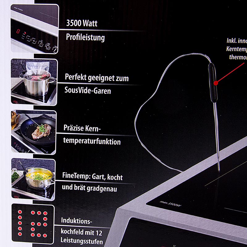 - innovatives, präzises ThermoControl-Thermometer (40-160°C in 1°C Schritten) - Perfekt für punktgenaues Braten, für das Sous Vide Garen oder Warmhalten von Speisen - Leistungsstarke 3500 Watt - Hochwertiges Edelstahlgehäuse - Glaskeramik-Ganzglasoberfläche - Temperatur präzise einstellbar von 60-240°C