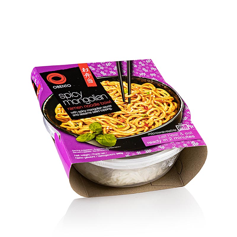 ZUTATEN / PRODUKTINFO: Ramen-Nudeln mit würziger mongolischer Soße. Zutaten: 78,3% Nudeln (Wasser, WEIZENMEHL, Sonnenblumenöl, GLUTEN, Salz, Säureregulator: E270), 20% würzige mongolische Sauce (Wasser, Rohrzucker, SOJASAUCE [SOJABOHNEN, WEIZEN], Chilipaste, Zwiebeln, Reiswein [Reis, Wasser], Knoblauch, SOJAÖL, Ingwer, süße Bohnenpaste [WEIZEN], saure Pflaumenpaste [Säureregulator: E330, E331, Verdickungsmittel: E415, Farbstoff: E150c], Essig [Wasser, Klebreis, WEIZENKLEIE, Zucker, Salz], SESAMÖL, Geschmacksverstärker: E620, Verdickungsmitte: E1422, E415, Gewürze, Farbstoff: E150c, Aroma, Chiliöl), 0,8% getrocknetes Gemüse (getrocknete Karotten, getrocknete Paprika, getrocknete Frühlingszwiebeln), 0,8% Garnierung (SESAMSAMEN). Zubereitung: Inhalt aus der Schüssel nehmen. 4 Esslöffel Wasser und das getrocknete Gemüse in die Schüssel geben. Nudeln und Sauce hinzugeben und abdecken, ohne die Schüssel komplett zu schließen. Erhitzen Sie die Schüssel in der Mikrowelle bei hoher Leistung für ca. 2 Minuten. Durchrühren bis alles gleichmäßig vermischt ist und fügen Sie die Sesamsamen hinzu.